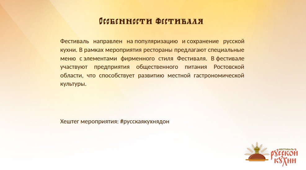 Предприятия общественного питания Ростовской области представят посетителям уникальное традиционное меню блюд русской кухни, отмеченное фирменным логотипом.