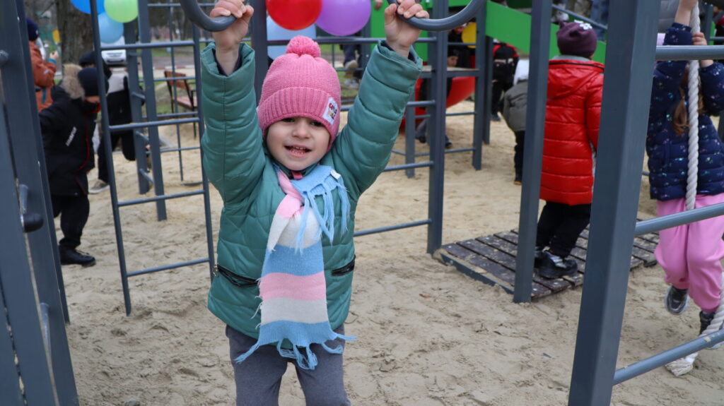 После поздравительных выступлений наступил торжественный момент перерезания ленты. Почётное право было предоставлено Дмитрию Репке и Сергею Бочаловому. Когда красная лента была перерезана, мальчишки и девчонки радостно устремились на спортивно-игровую площадку. Дети с большим удовольствием резвились, веселились, шутили, в общем, детский смех не смолкал! Их внимание было сосредоточено на игре, но мне все равно удалось с ними поговорить.