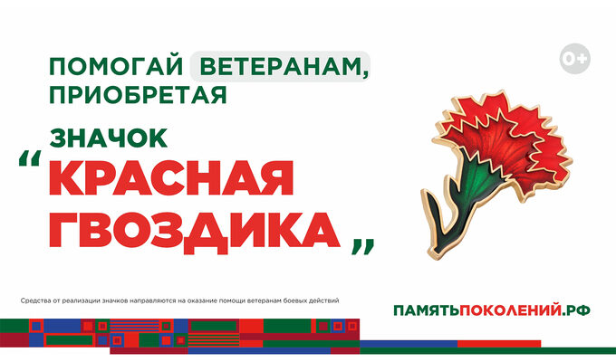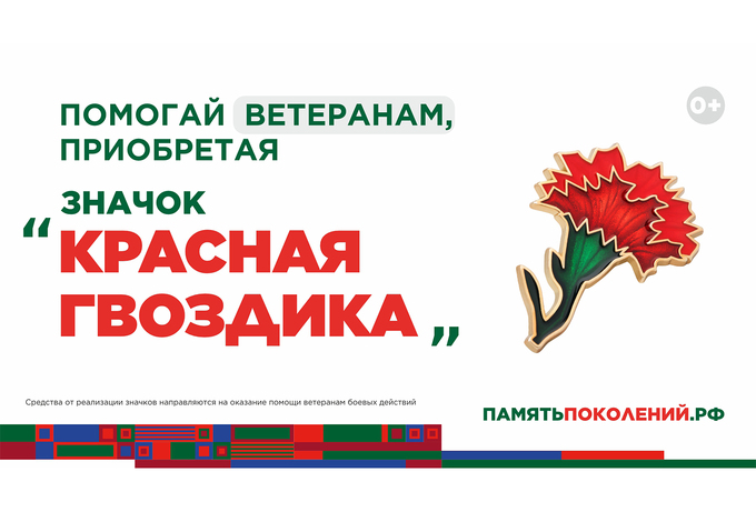 С 10 апреля по 22 июня благотворительный фонд «Память поколений» в одиннадцатый раз проведет акцию «Красная гвоздика». Приобретая за пожертвование значок красной гвоздики, жители России смогут поддержать ветеранов Великой Отечественной войны и других боевых действий.