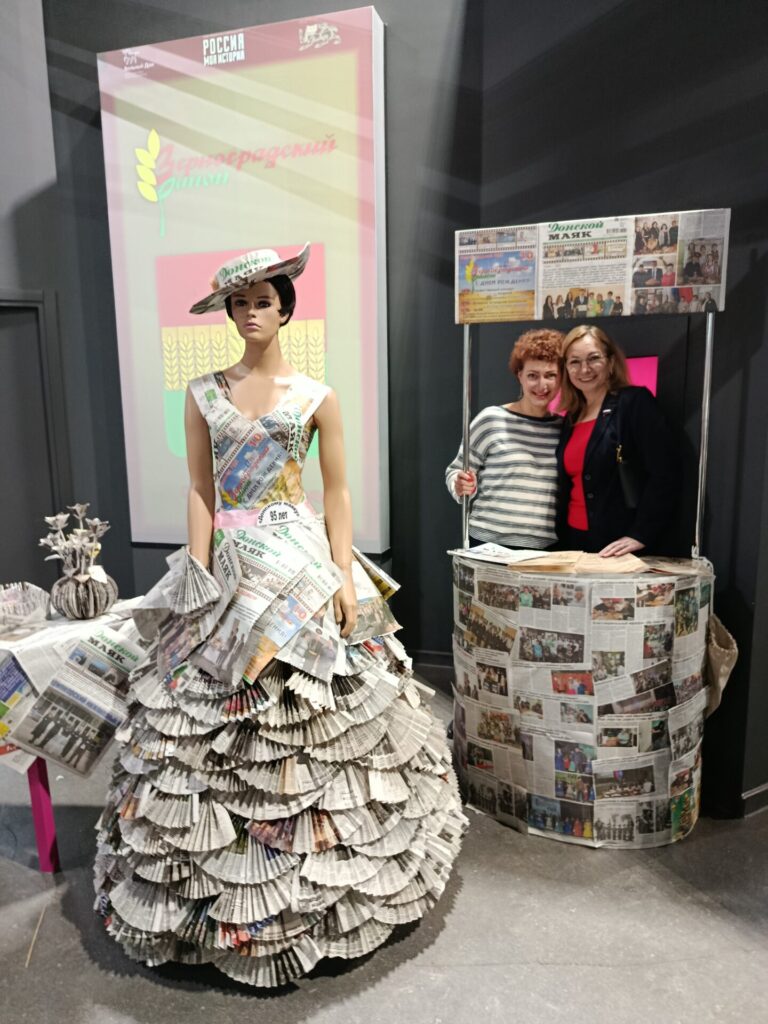 Особым украшением и изюминкой экспозиции стала яркая и креативная площадка газеты «Донской маяк». Наше издание поразило воображение гостей уникальным арт-объектом: настоящим платьем, полностью выполненным из газетных полос! Девушка в этом необычном наряде стала центром притяжения взглядов, продемонстрировав, как творчески и с выдумкой можно подойти даже к привычным вещам. Посетители просто были влюблены в барышню «Донской маяк». Даже Лариса Николаевна Тутова не обошла стороной наш необычный павильон…