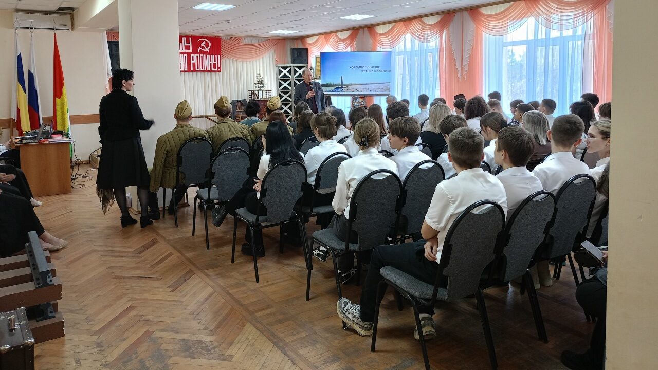 Гвардии полковник в отставке Конюхов В.Я., служивший в ракетных войсках стратегического назначения, ныне писатель-краевед, поделился с ребятами, как им писалось обоснование на присвоение хутору Каменный «Место воинской славы…».