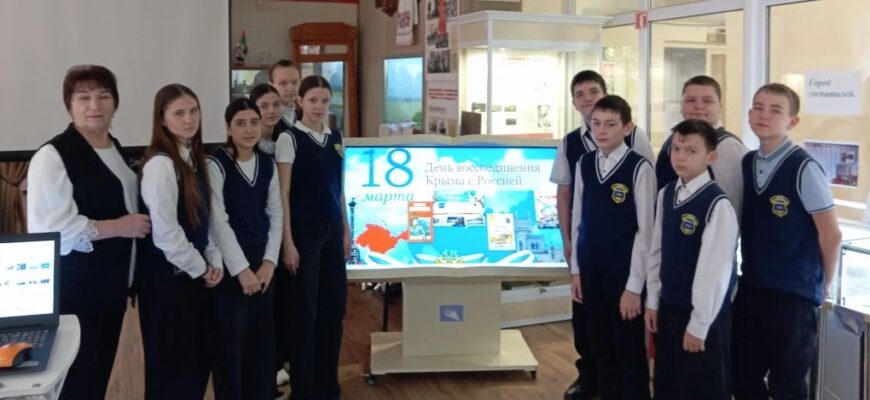 Наш 6 класс МБОУ Клюевской СОШ с классным руководителем Кожевниковой Т.М. 18 марта посетили Зерноградский историко-краеведческий музей, где была проведена экскурсия «Крымская весна. Воссоединение Крыма с Россией», которая посвящена миру, дружбе, согласию между людьми. Сотрудники музея подготовили интересный сценарий. Все активно участвовали в мероприятии, получили много интересной информации, положительных эмоций, испытывали гордость за нашу Россию. Из презентации поняли, что Крым — одно из красивейших мест планеты, увенчанное прекрасными творениями природы и человека, покоряющее нас своим особым романтическим настроением. Мы окунулись в историю Крыма. Экскурсовод рассказала нам, что история Крыма — это легенда, это песня, записанная нотами пещерных городов, камнями средневековых замков и крепостей; это крещение князя Владимира, противостояние России с Крымским ханством и завоевание Крыма Екатериной второй; это Крымская война 1854 года и оборона Севастополя во время Великой Отечественной войны; это великий труд и подвиг людей многих национальностей, это отвага, честь и доблесть наших солдат.