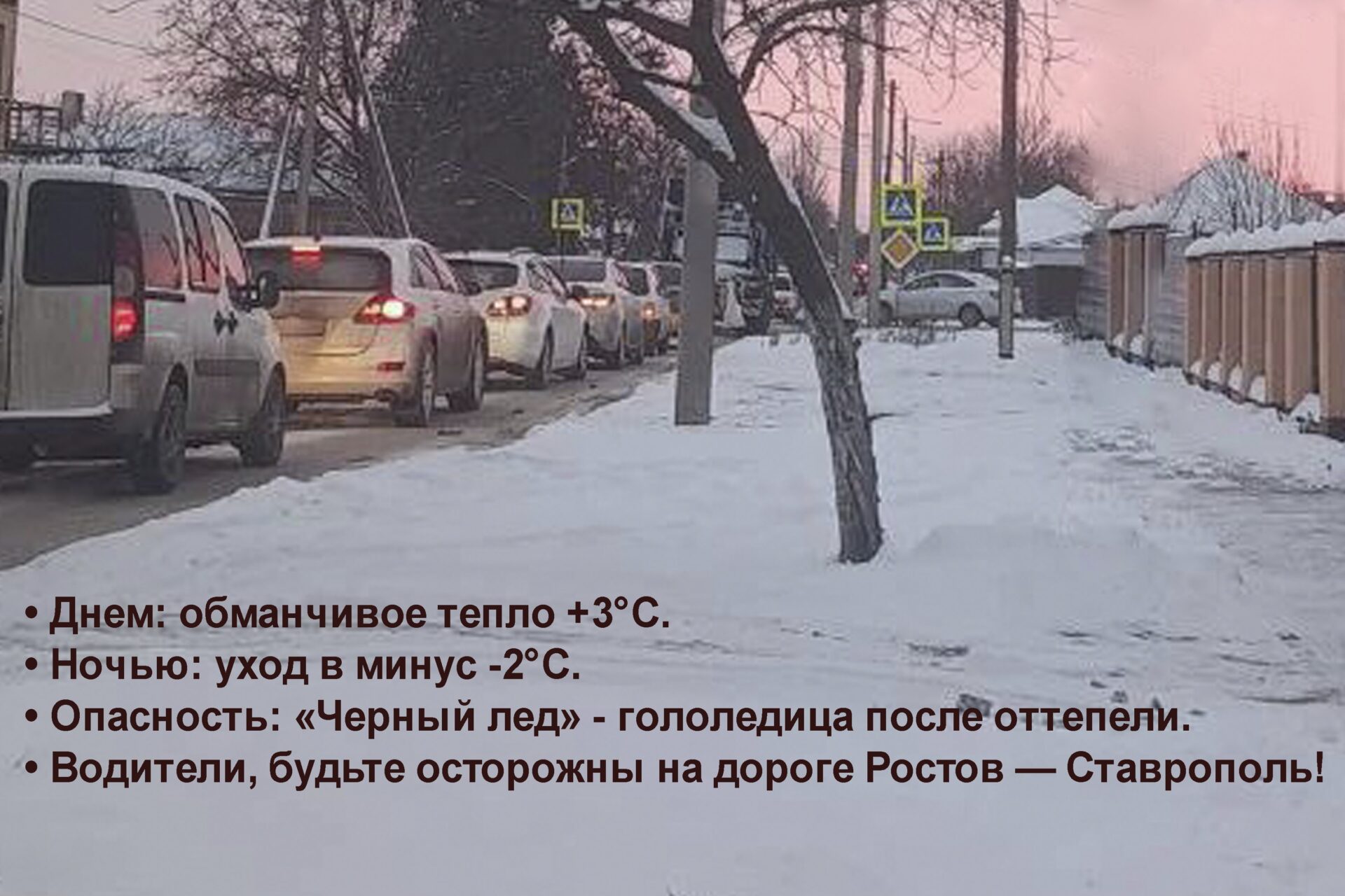 Будьте осторожны на дорогах! Если идёте пешком — берегите ноги! Обувайтесь в нескользкую обувь.