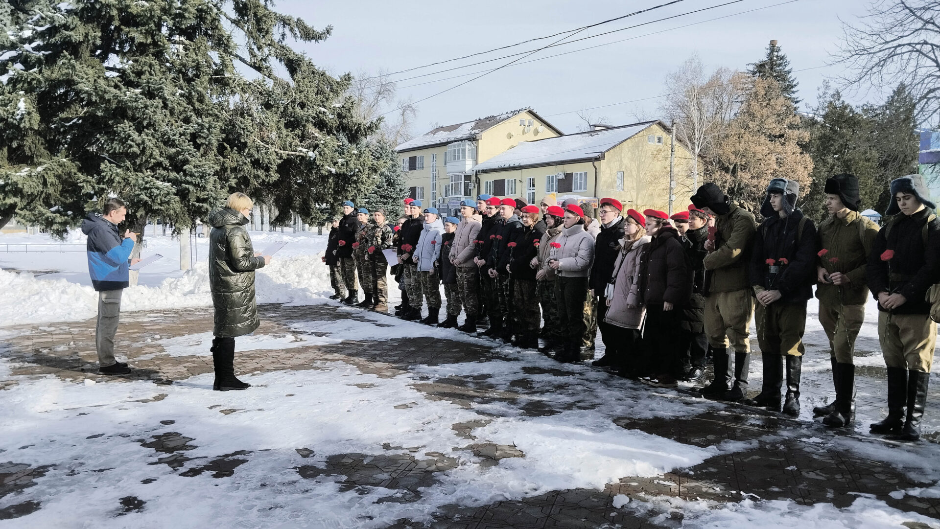 Начался квест возле Вечного огня, где состоялся митинг памяти, на котором ребятам напомнили о героических событиях, проходивших здесь в 1943 году, после чего юнармейцы возложили цветы к памятнику «Наступление».