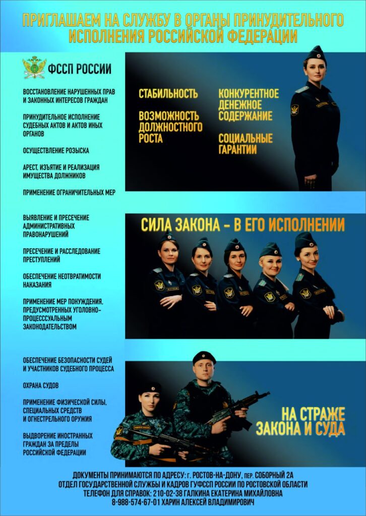 Отделение судебных приставов по Кагальницкому и Зерноградскому районам Главного управления Федеральной службы судебных приставов по Ростовской области приглашает на службу в органы принудительного исполнения граждан Российской Федерации от 18 и до 40 лет, имеющих образование среднее — профессиональное для должностей младшего начальствующего состава и высшее образование для должностей среднего начальствующего состава способных по своим личным и деловым качествам, физической подготовке и состоянию здоровья исполнять служебные обязанности сотрудника органов принудительного исполнения.