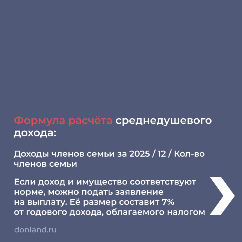 Она положена, если среднедушевой доход семьи не больше 1,5 прожиточного минимума на душу населения в регионе за 2025 год. В Ростовской области — 25 003,5 ₽.