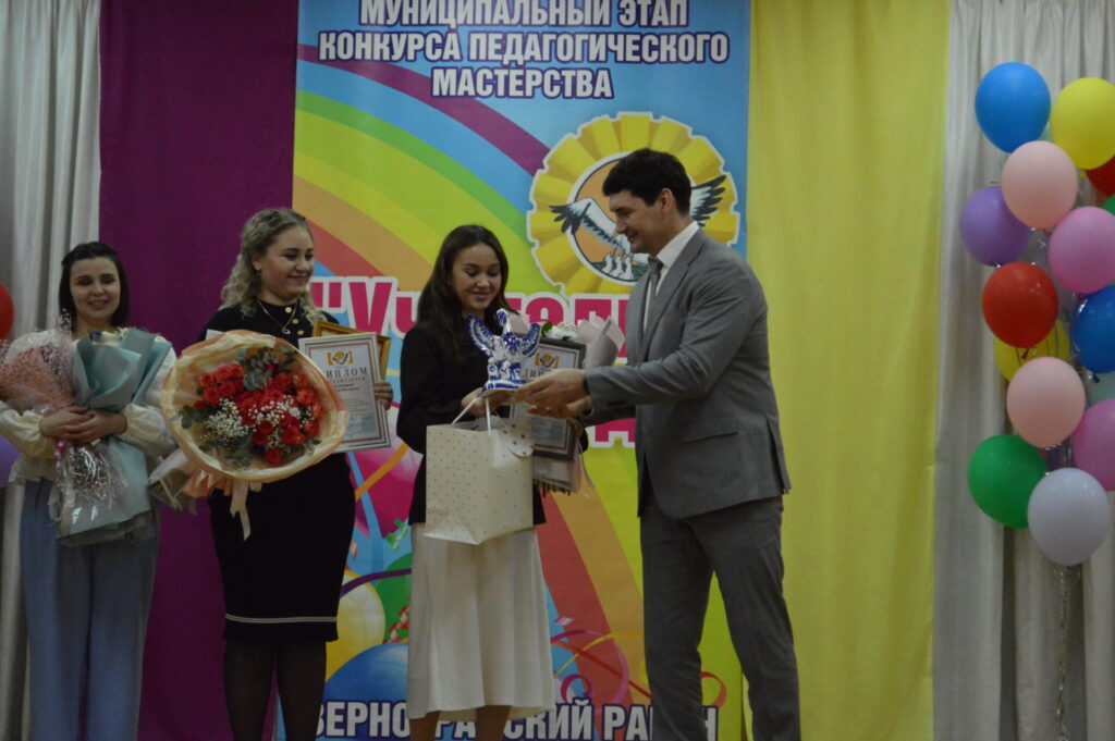 В номинации «Учитель» победителя объявил Глава Зерноградского района Дмитрий Анатольевич Репка — им стала Регина Данисовна Курбатова — учитель начальных классов МБОУ СОШ Зернограда. Дмитрий Анатольевич, выступая, поблагодарил всех конкурсантов за участие, а победителям пожелал достойно представить Зерноградский район на областном этапе Всероссийского конкурса «Учитель года».