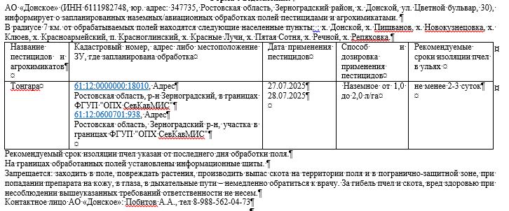 АО «Донское» (ИНН 6111982748, юр. адрес: 347735, Ростовская область, Зерноградский район, х. Донской, ул. Цветной бульвар, 30), информирует о запланированных наземных/авиационных обработках полей пестицидами и агрохимикатами.