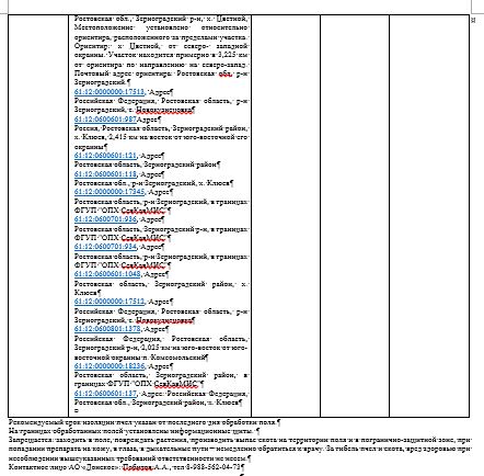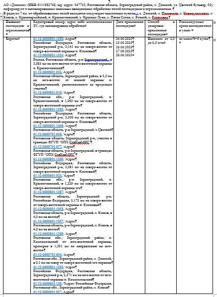 АО «Донское» (ИНН 6111982748, юр. адрес: 347735, Ростовская область, Зерноградский район, х. Донской, ул. Цветной бульвар, 30), информирует о запланированных наземных/авиационных обработках полей пестицидами и агрохимикатами.