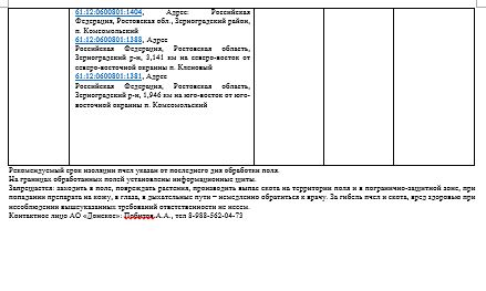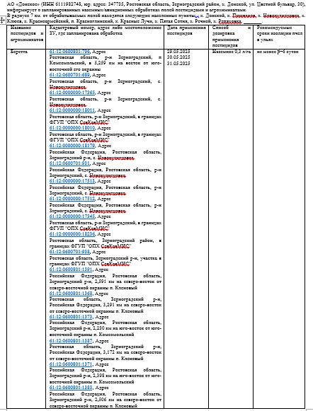 АО «Донское» (ИНН 6111982748, юр. адрес: 347735, Ростовская область, Зерноградский район, х. Донской, ул. Цветной бульвар, 30), информирует о запланированных наземных/авиационных обработках полей пестицидами и агрохимикатами. В радиусе 7 км. от обрабатываемых полей находятся следующие населенные пункты: : х. Донской, х. Пишванов, х. Новокузнецовка, х. Клюев, х. Красноармейский, п. Красноглинский, х. Красные Лучи, х. Пятая Сотня, х. Речной, х. Репяховка.