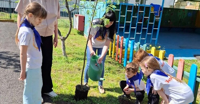 Экологическое воспитание: в 2024 году юные «Эколята» высадили две березки, восполняя зеленый фонд аллеи.