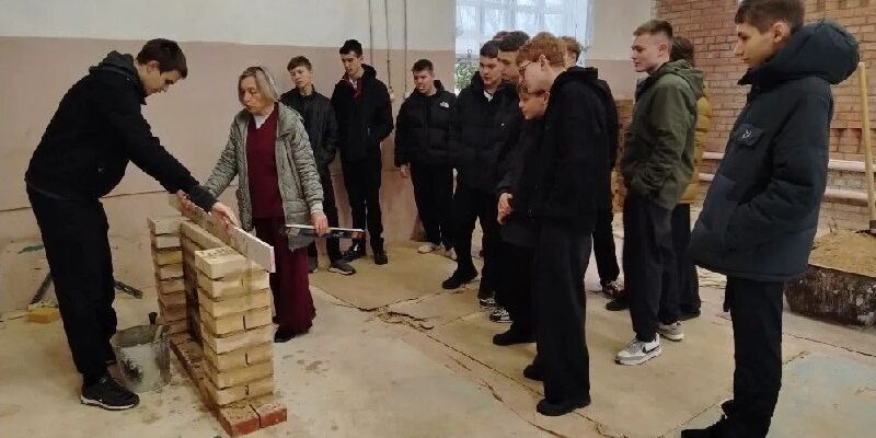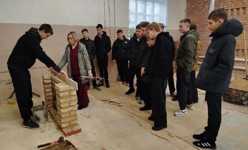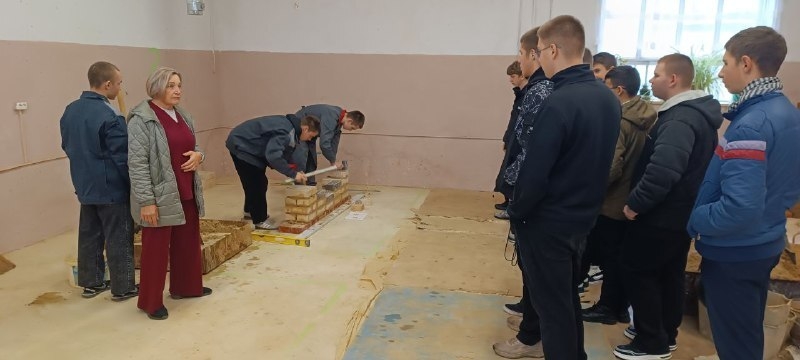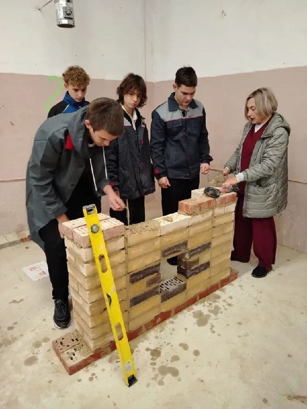 Школьники самостоятельно под надзором преподавателя приняли участие в установке кирпичной кладки с безцементной смесью.