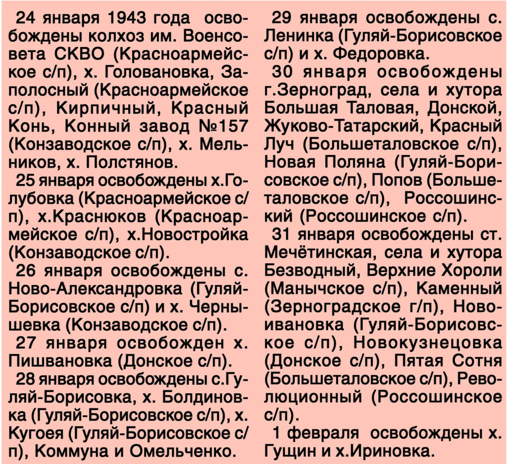 Зерноградцы с любовью и искренней благодарностью вспоминают тех, кто в суровые январские дни 1943 года изгнал фашистских оккупантов с родной земли.
